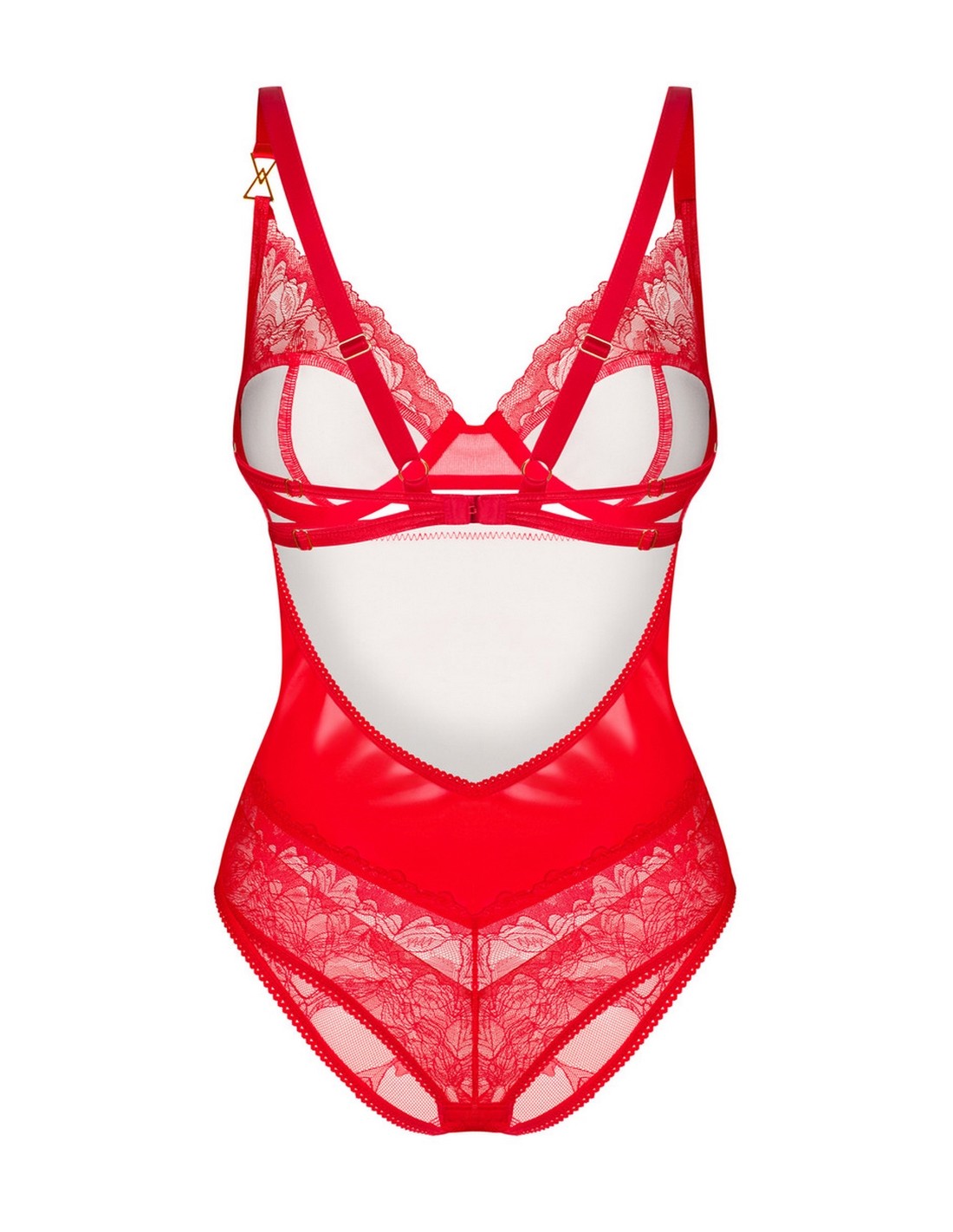 Body Aliosa w czerwonym kolorze stworzone z gładkiego, elastycznego materiału. Całość wykończona ozdobną koronką. Gustowne dodatki oraz wycięcie pod piersiami dodają całości luksusowego charakteru. Perfekcyjne dobranie gwarantują fiszbiny, regulowane ramiączka oraz paski w obwodzie biustu.