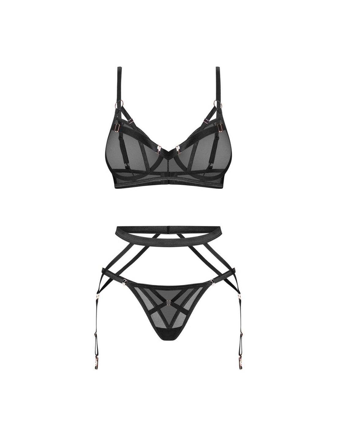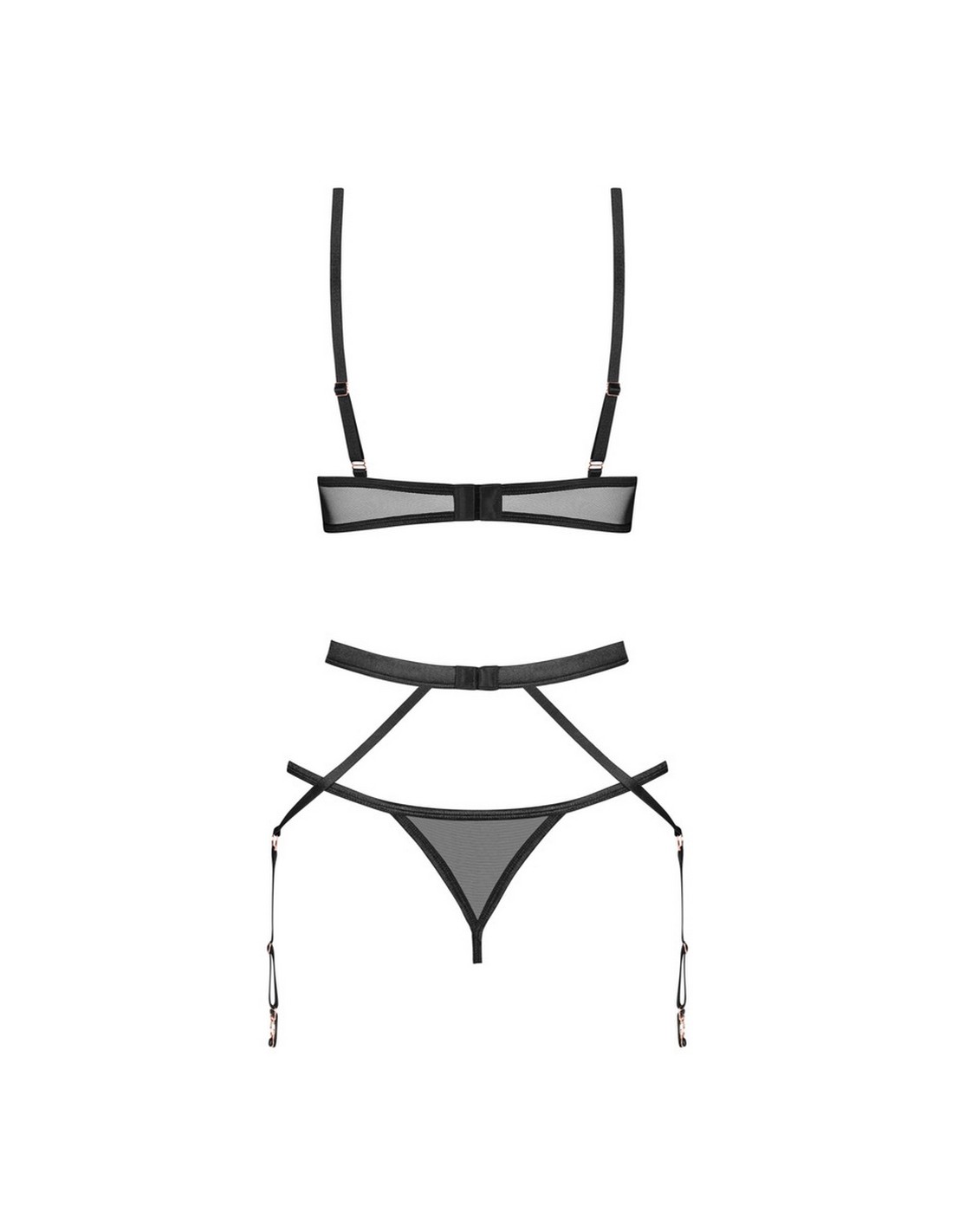 Zachwyć się wyjątkową elegancją i odważnym charakterem kompletu Euridia. Ten trzyczęściowy zestaw w klasycznej czerni to połączenie nowoczesnego designu i ponadczasowej zmysłowości. Stanik z fiszbinami, pas do pończoch i stringi tworzą harmonijną całość, która świetnie zaznacza kobiecą sylwetkę. Transparentny materiał delikatnie odsłania ciało, a subtelne dodatki w kolorze rose gold nadają całości luksusowego wyrazu. Regulowane paski i ramiączka umożliwiają wyśmienicie dopasować komplet do figury - dla komfortu i pełni pewności siebie.
