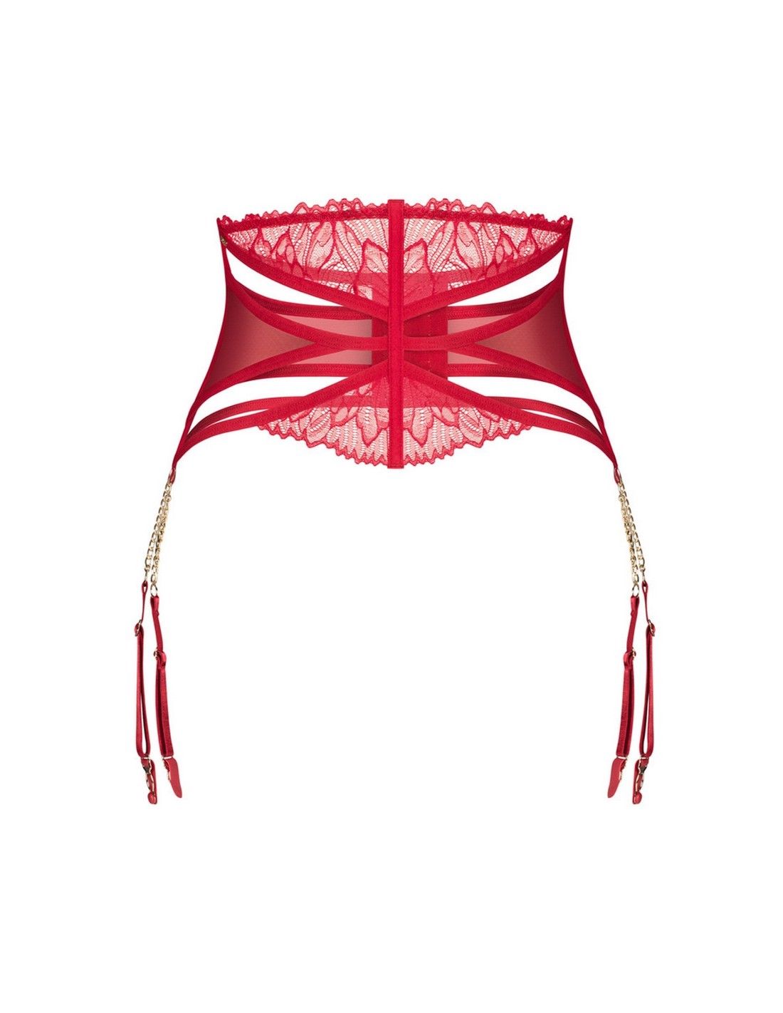Czerwony pas do pończoch stworzony z myślą o kobietach, które kochają bieliznę z charakterem. Połączenie delikatnej koronki z transparentną siateczką tworzy gustowny i uwodzicielski efekt. Wbudowane pionowe fiszbiny subtelnie modelują talię, nadając sylwetce perfekcyjne proporcje. Z tyłu znajduje się wielostopniowe zapięcie, umożliwiające bardzo dobre dobranie. Całość dopełniają zjawiskowe paski do pończoch zakończone złotymi łańcuszkami, które dodają całości luksusowego charakteru. To bielizna, która łączy kobiecą finezję z nowoczesnym pazurem.