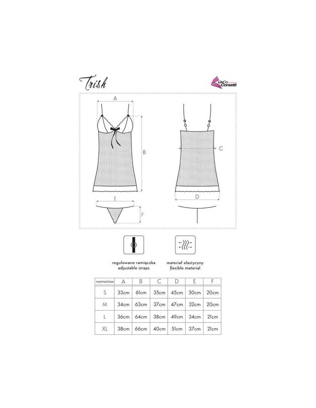 Livia Corsetti Trish klasyczna koszulka nocna w połączeniu ze stringami. Model ten ma miękkie miseczki stworzone z pięknej czarnej koronki, natomiast dolną część tworzy delikatny cieniutki materiał w kolorze czarnym z białymi kropkami. Dolną część koszulki zdobi koronkowe wykończenie. Wdzięku całość dodaje delikatna satynowa kokardka pomiędzy miseczkami. Skład materiału: 90% poliamid, 10% elastan.